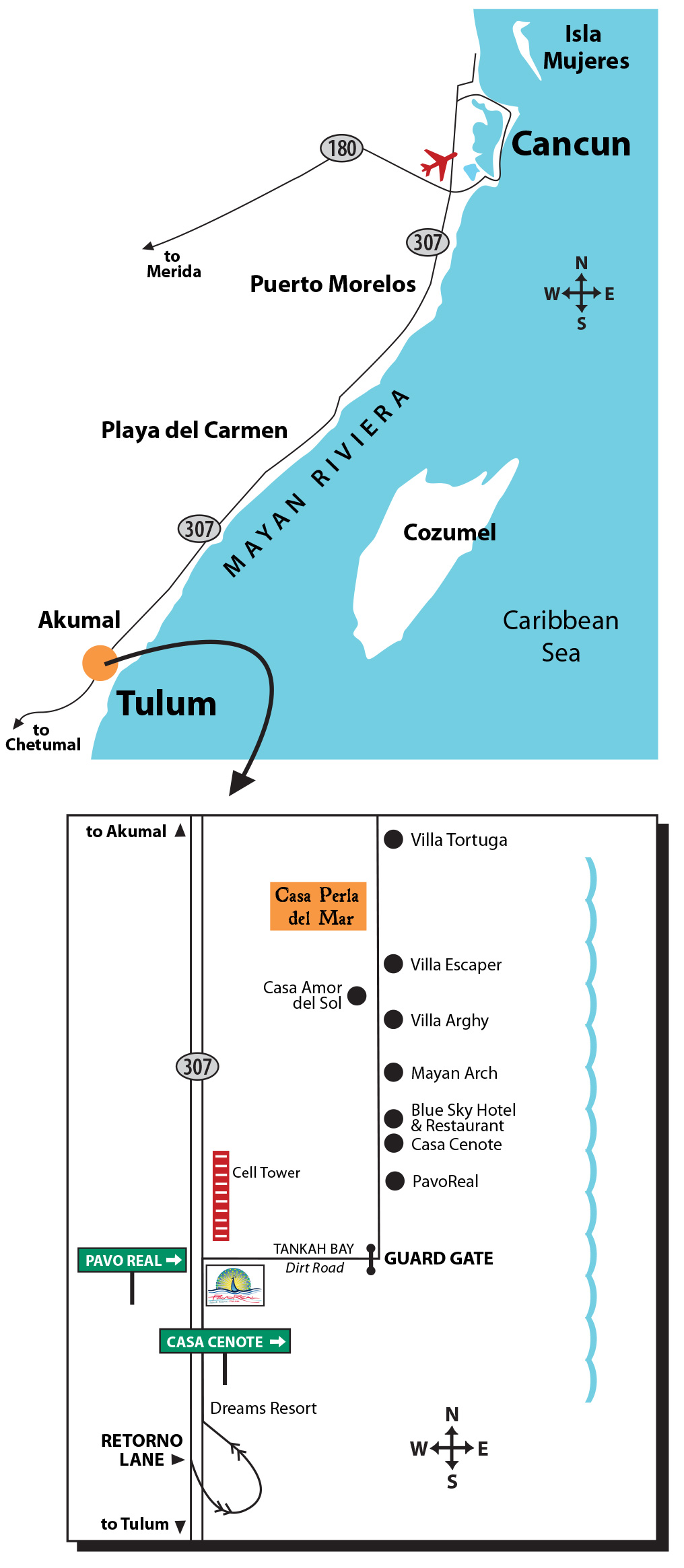 > Just past DREAMS RESORT you will see a large Sign for CASA CENOTE & PAVO REAL – There is also a huge cell tower